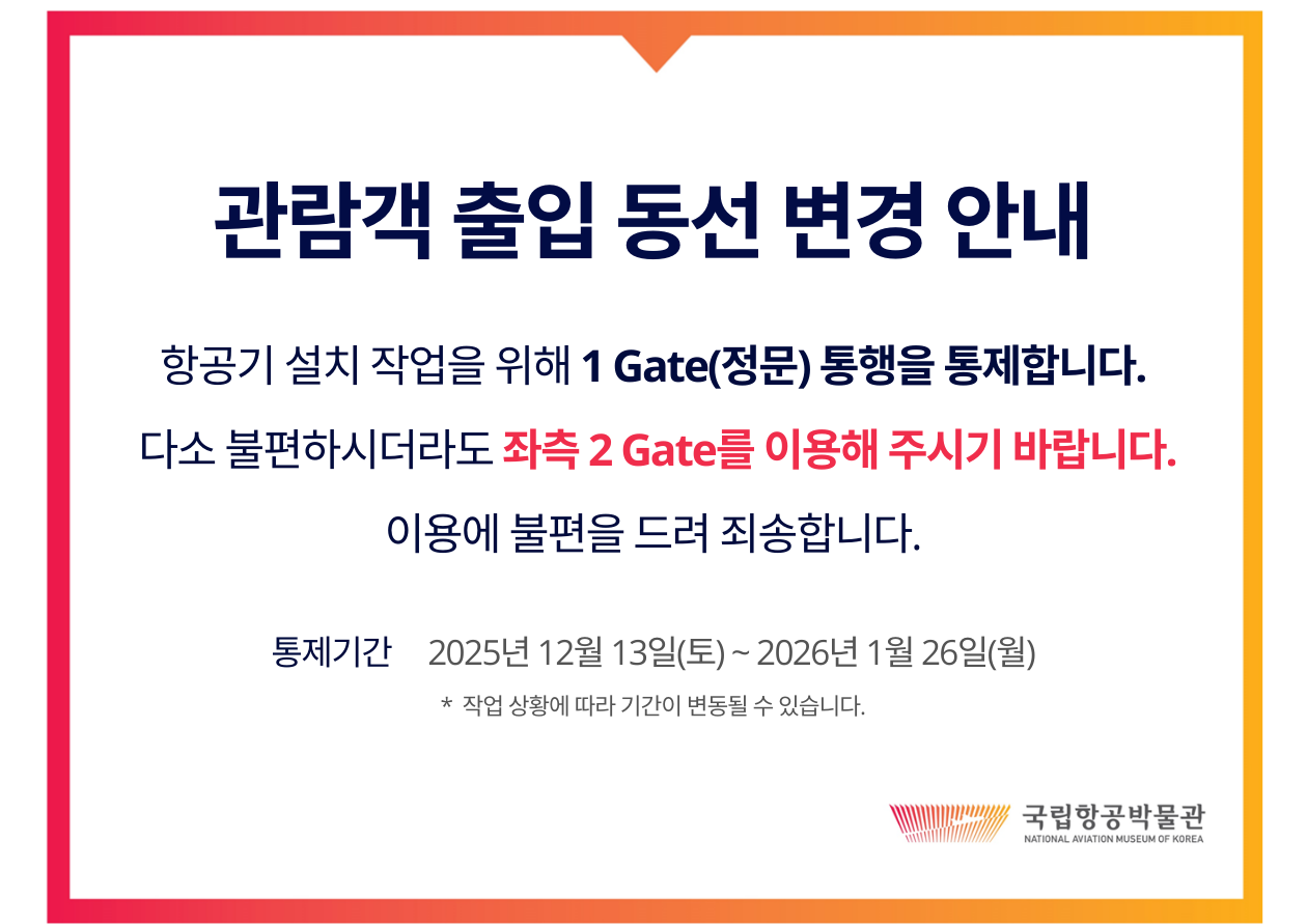 항공기 설치 작업이 진행됨에 따라, 1 게이트(정문) 출입이 일시적으로 제한됩니다.