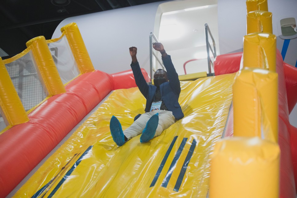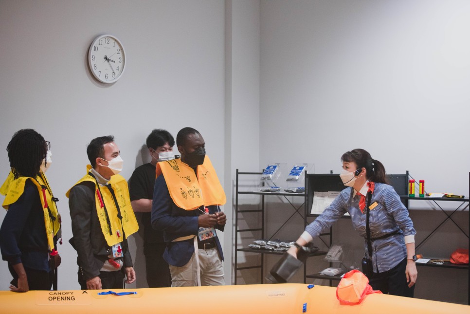 기내훈련체험에서는 비상시 기내에서의 대처방법과, 비상 슬라이드로 탈출하는 체험을 해 보았습니다.