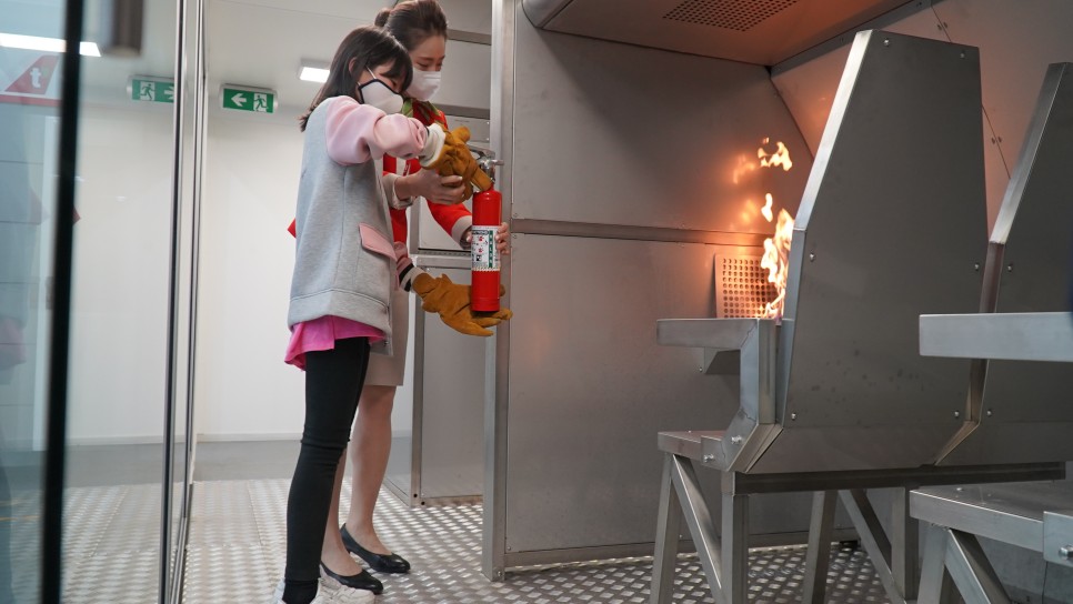 현직 승무원 선생님들께 기내 화재진압 훈련 등 다양한 안전훈련과 승무원 직업체험을 배워보았습니다.