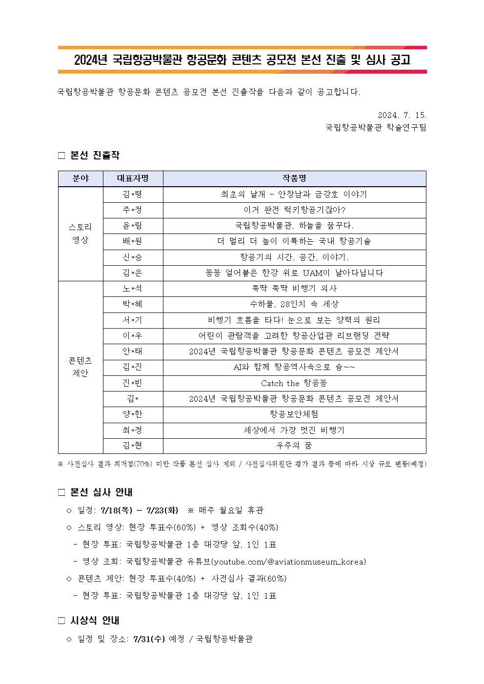 [재공지] 2024년 국립항공박물관 항공문화 콘텐츠 공모전 본선 진출작 공고