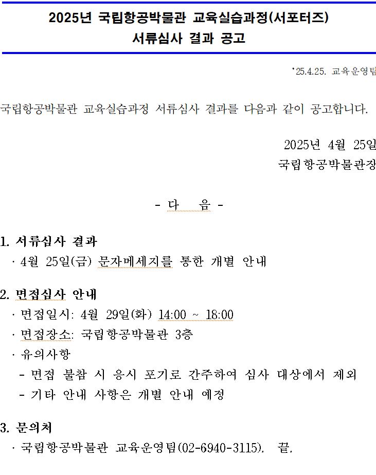 2025년 국립항공박물관 교육실습과정(서포터즈) 서류심사 결과 공고