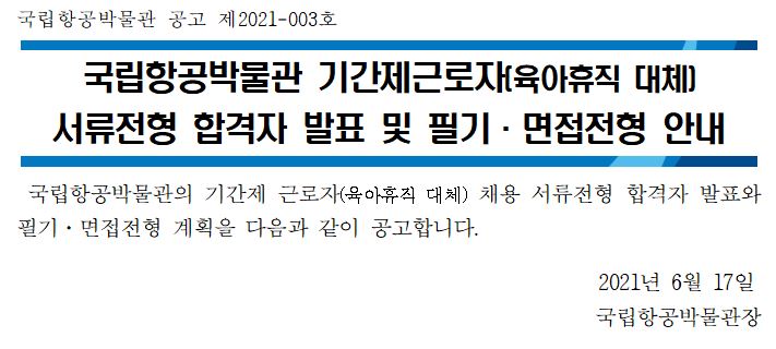 [채용] 국립항공박물관 기간제근로자(육아휴직자 대체) 서류전형 합격자 발표 및 필기 · 면접전형 안내