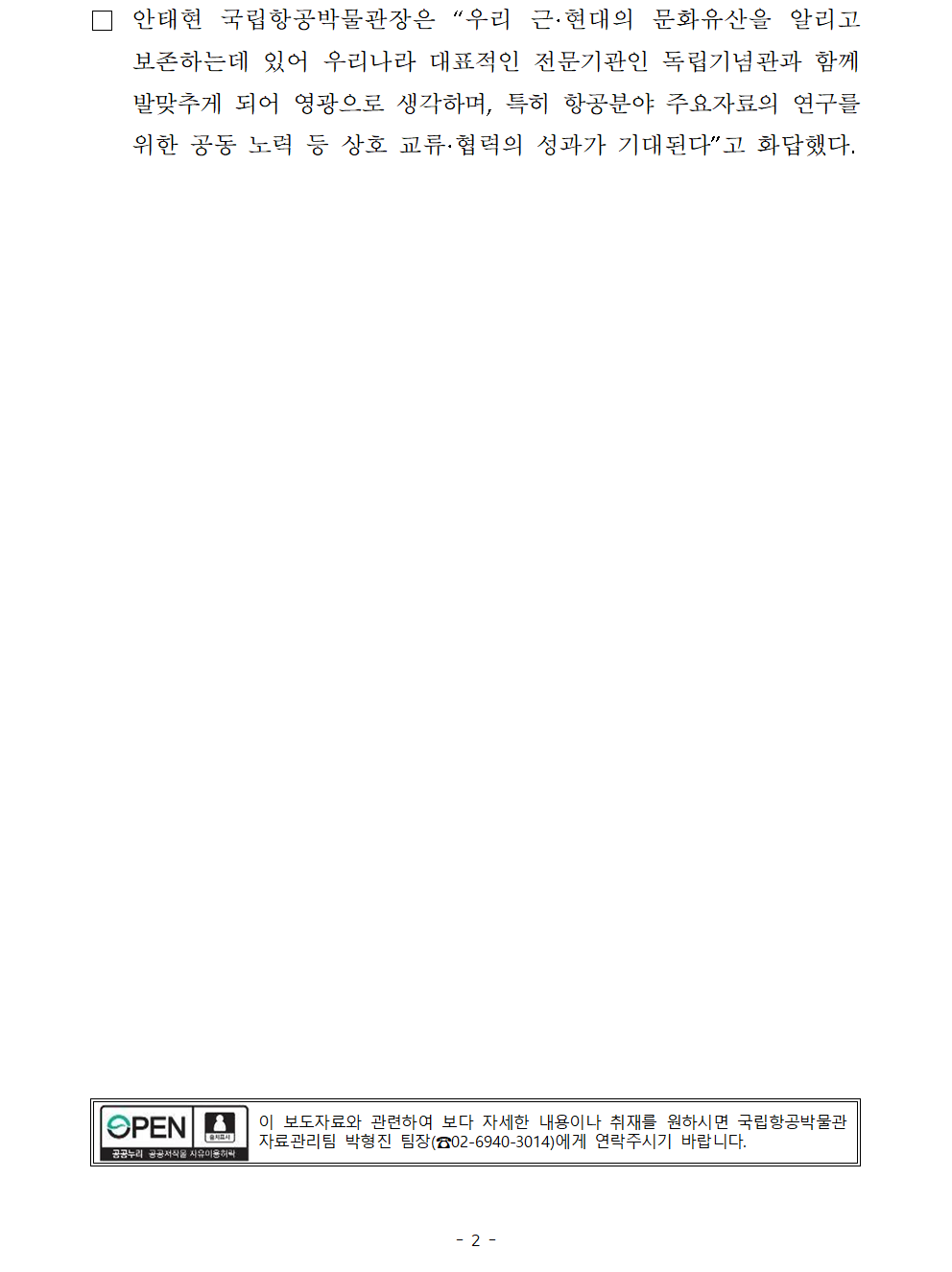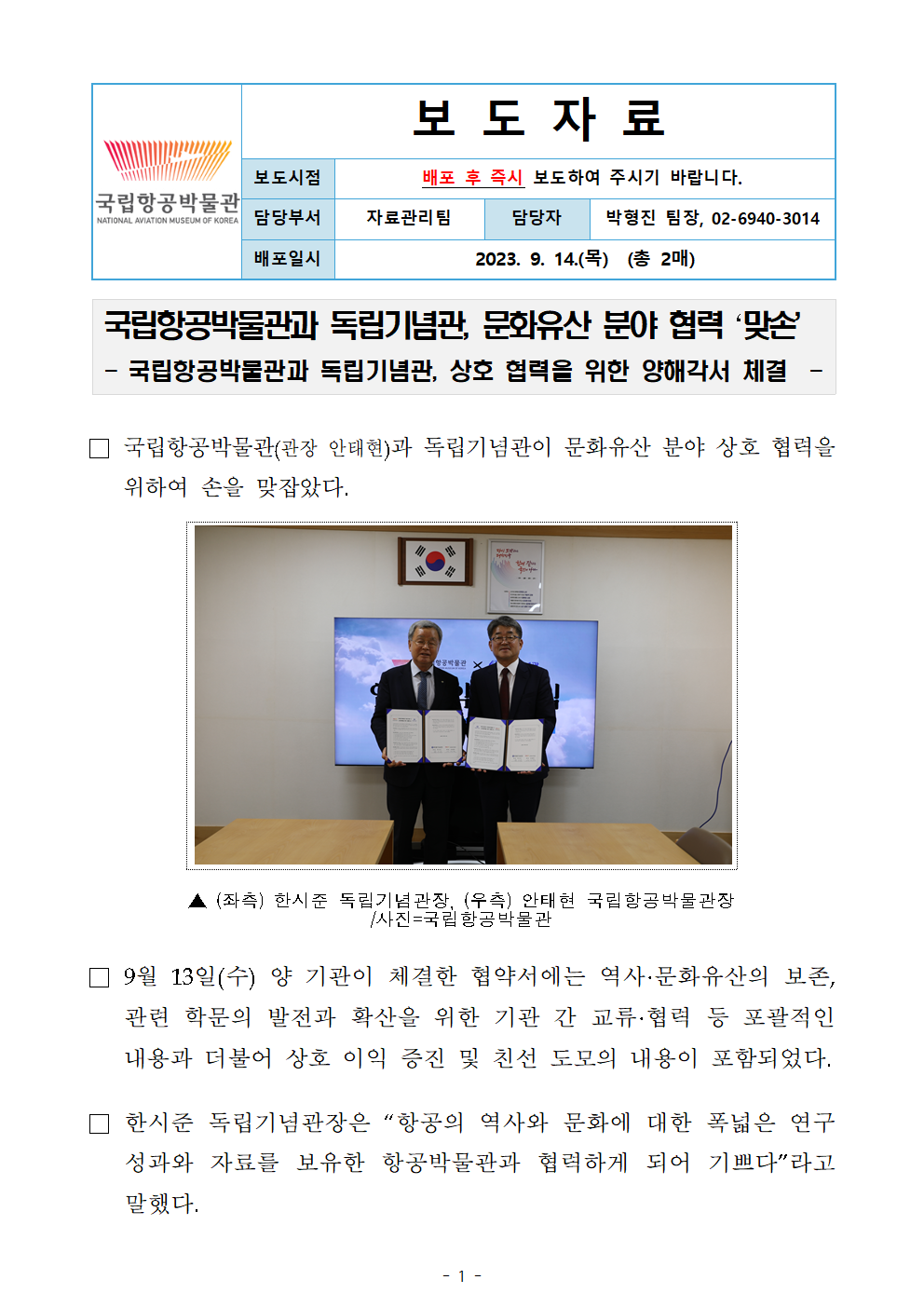[보도자료]국립항공박물관과 독립기념관, 문화유산 분야 협력 맛손 - 상호협력을 위한 양해각서 체결-.hwp
