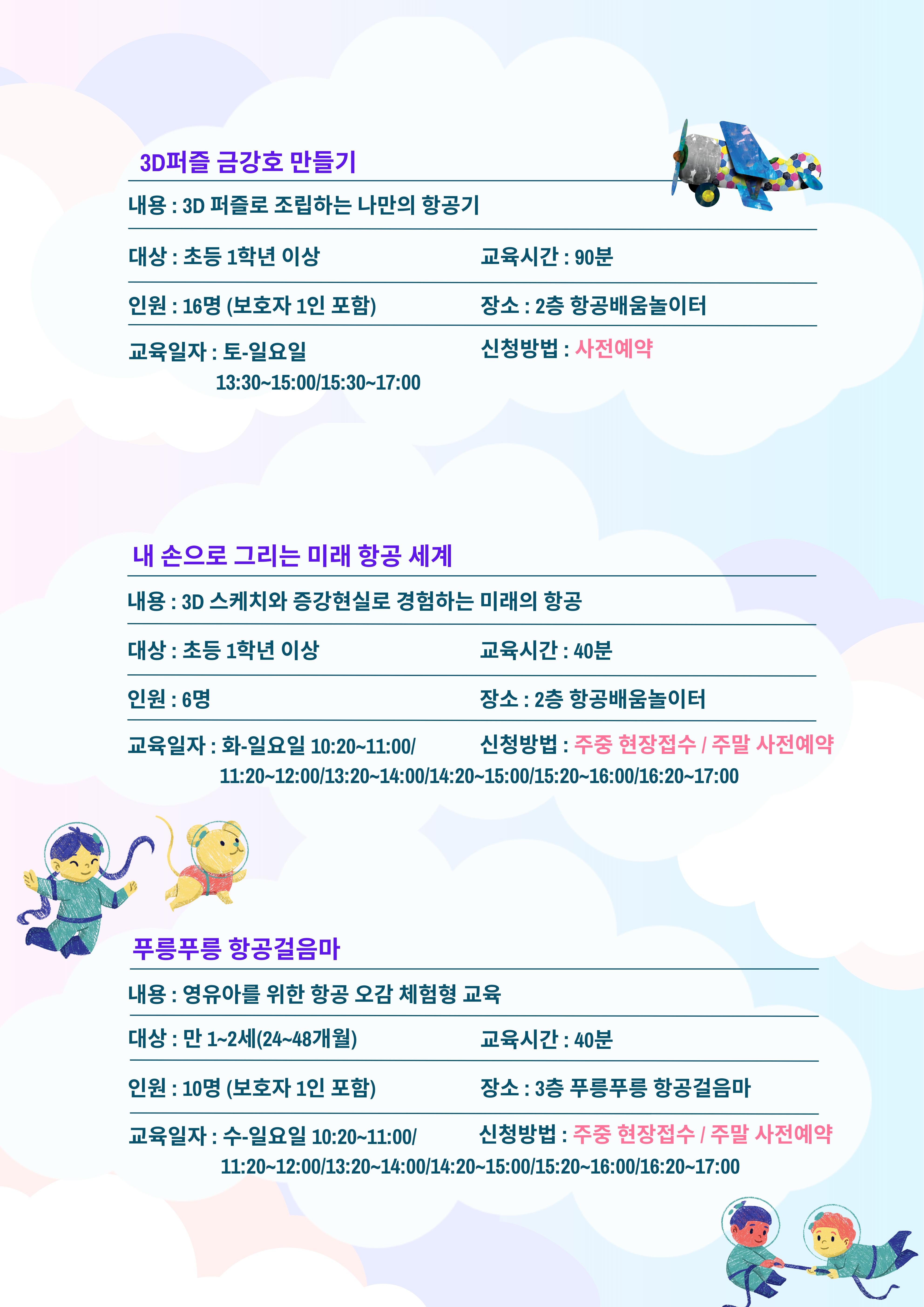 · 교육 당일 2층 항공배움놀이터 안내데스크 앞에서 예약정보 확인 후 입장 가능합니다.